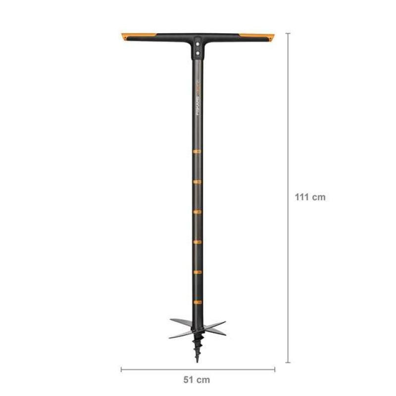 A hagyományos spirálmenetes megoldást a Fiskars a két, egymással optimális szöget bezáró bóracél pengével váltotta fel. Ez a kivitel segíti a fúrást, még az ellenállóbb talajtípusok esetében is. A szerszám nem akad el, mivel a menet mélyebbre nyúlik. A kifúrt föld egyben, egy kis halomban emelhető ki a lyuk kifúrása után.