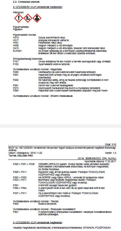 Almatermésűek, szőlő (bor) feketerothadás, peronoszpóra, varasodás betegségei elleni gombaölő szer. A Delan Pro egyik alappillére a külső védelmet biztosító, három ponton ható kontakt ditianon, a másik összetevője pedig a fungicid- és immunizáló hatással egyaránt rendelkező, belső védelmet biztosító szisztemikus kálium-foszfonát (foszforossav), amely a legtöbb felszívódó peszticid molekulánál gyorsabban szállítódik a növényben. Alma A varasodás elleni védekezés alapját jelentő, jól ismert ditianon hatóanyagunk 50 éve szolgálja az almatermesztőket. Ezidő alatt számtalan formulációs váltáson esett át. 2017-től megújult, immár folyékony (SC) formulációban érhető el egy foszforossavas megerősítéssel, mely 10%-os hatékonyság növelést jelent a Delan? 700-hoz képest. A Delan? Pro motorja továbbra is a megbízható ditianon maradt, a kerekeket azonban 21. századira cseréltük, mely a mobilis foszforossav lett. Szőlő A peronoszpóra és feketerothadás elleni védelemben forradalmi áttörést jelentett a Delan? Pro bevezetése. Mivel a ditianon önmagában több ponton avatkozik be a peronoszpóra gomba életfolyamataiba, ezért a rezisztencia kockázat kialakulása minimális. A foszforossav egyrészt erős közvetlen fungicid hatással rendelkezik, másrészt közvetett immunizáló hatásának köszönhetően a ditianont tovább erősíti. Mindezekhez az előnyökhöz hozzáadódik a foszforrossav rendkívüli mobilitása a növényen belül, így nem csak a fürtöt, hanem a friss növekményt is kimagasló védelemben részesíti. Hatóanyag: 125 g/l ditianon, 561 g/l kálium foszfonátok Formuláció: EC Kiszerelés: 2,5 ml, 100 ml, 500 ml, 5 l Kultúra: almatermésűek, szőlő(bor) Károsító: feketerothadás, peronoszpóra, varasodás Kijuttatási időszak: szőlő: 5 leveles állapottól borsó nagyságú bogyó állapotig (BBCH 15-75) almatermésűek: virágrügy pattanástól az érés kezdetéig (BBCH 53-81) Dózis: szőlő: 1,8-3 l/ha almatermésűek 0,8-2,5 l/ha Permetlé: szőlő: 200-1200 l/ha almatermésűek: 150-1500 l/ha Munkaegészségügyi várakozási idő: 0 nap Élelmezés-egészségügyi várakozási idő: 35-42 nap Forgalmazási kategória: II. kategória