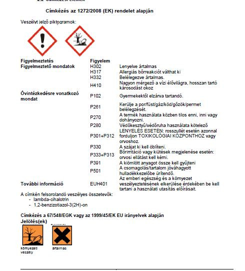 Full 5cs azonos a Karate Zeon 11769/2002. FVM számon engedélyezett rovarölő szerrel. Széles hatású kontakt rovarölő permetezőszer. Házikerti adagolása: 2-3 ml / 10 liter víz Hatóanyag: 50 g/l lambda-cihalotrin Forgalmazási kategória: III (szabad forgamú) A mikrokapszulázott Full 5cs a korábbi formulációkkal szemben hosszabb hatás-tartamú, kiváló esőállóságú, a környezetet és a felhasználót jobban kíméli. Felhasználható: Gabonában a vetésfehérítő bogár, a gabonapoloska és a levéltetű okozta kártétel megfékezésére 0,15–0,2 l/ha mennyiségben. Gyümölcsösben (almatermésűek, csonthéjasok), feketebodzában molykártevők, levéltetvek és gyümölcslegyek ellen 0,2–0,3 l/ha. Szőlőben szőlőmolyok ellen 0,15–0,25 l/ha dózisban. Zöldségfélék (paprika, paradicsom, káposztafélék, uborka) szívó és rágó kártevői ellen 0,2–0,4 l/ha dózisban. Kukoricában kukoricabogár, kukoricamoly, bagolylepke-hernyók ellen 0,25–0,3 l/ha dózisban. Cukorrépa, lucerna, repce, mustár rovarkártevői elleni védekezésre 0,15–0,2 l/ha a megfelelő mennyiség. Napraforgóban 0,15–0,2 l/ha dózisban levéltetvek és poloskák ellen. Burgonyában levéltetvek ellen 0,15–0,2 l/ha adagban. Borsóban levéltetvek ellen 0,15–0,2 l/ha dózisban. Javasolt permetlémennyiség: Szántóföldön a lombfelület függvényében 300–500 l/ha, zöldségfélékben 500–600 l/ha, szőlő, gyümölcsös 600–1000 l/ha, légi kijuttatásnál 70–80 l/ha Munkaegészségügyi várakozási idő: 0 nap Méregjelzés, veszélyesség: Méreg. Veszélyjel: Xn (ártalmas), N (környezeti veszély). Vízi szervezetekre kifejezetten veszélyes. Méhekre mérsékelten veszélyes. Virágzó kultúrákban csak méhkímélő technológiával juttatható ki. Élelmezés-egészségügyi várakozási idő: gyümölcs, szőlő: 3 nap káposztafélék, paradicsom, uborka, borsó: 3 nap paprika: 5 nap burgonya, cukorrépa, feketebodza: 14 nap repce, mustár (magban): 28 nap lucerna, kalászosok (magban): 28 nap napraforgó: 28 nap csemegekukorica: 3 nap, kukorica (takarmány, vetőmag): 14 nap Eltarthatóság: 3 év Gyártó: Syngenta Kategória: Rovarölő szer Tömeg: 5ml Forgalmazási kategória III A termékleírás tájékoztató jellegű, a készítmény felhasználása előtt kérjük olvassa el a termék használati utasítást!