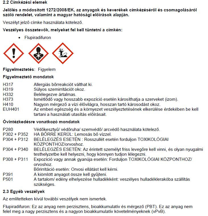 Légi kijuttatás: Nem engedélyezett. Vízi szervezetekre való veszélyesség: kifejezetten veszélyes Méhveszélyesség: nem jelölésköteles Tűzveszélyességi besorolás: nem jelölésköteles Felhasználható: