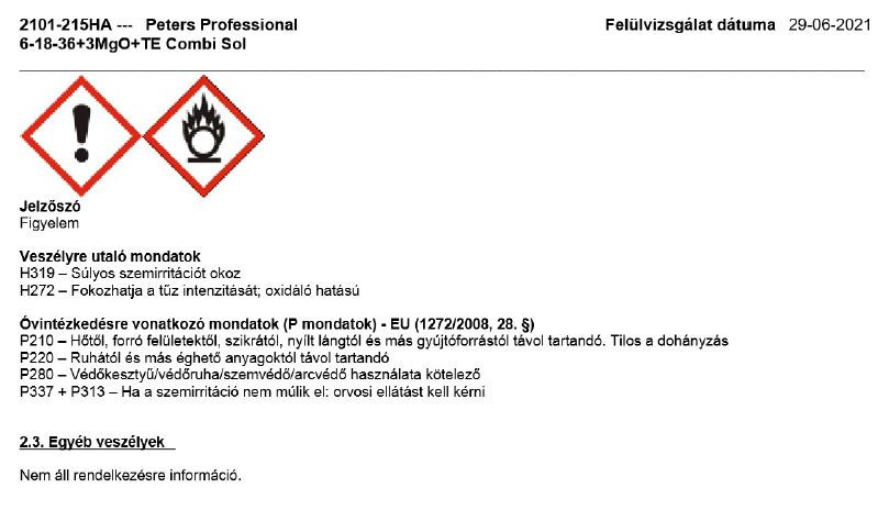 A Peters Professional 6+18+36 (Combi-Sol) öntözőműtrágyát kifejezetten hidrokultúrákhoz fejlesztették ki. Tökéletesen megfelel ezen növények különleges tápanyagigényének. Összetétel: 6-18-36+3MgO+TE Előnyei: " NPK-tartalom; magnéziumot és mikroelemeket tartalmaz " Magas hatóanyag-tisztaság, vivőanyag-mentes " Gyors növényi válasz reakció " Tőzeg alapú földkeverékben nevelt növények számára alkalmas " Egyedülálló M-77 kelátcsomagot tartalmaz " 100 %-ban vízoldható, apró szemcsék Használati utasítás: A Peters Professional 6+18+36 (Combi-Sol) megemelt mikroelem-tartalma hígított oldat formájában is igen jól hasznosul a növényben. Az 1:6 N:K-aránynak köszönhetően kompakt növekedés érhető el. Eredményesen használható magas nitrogéntartalmú öntözővíz esetén. Önállóan is alkalmazható. A Peters Professional 6+18+36 (Combi-Sol) Peters Excel műtrágyákkal nem keverhető. A tökéletes oldódás érdekében használat előtt 1-2 órával készítse el a törzsoldatot, használjon langyos vizet, és alaposan keverje el benne a műtrágyát. A felnyitott zsákot jól zárja le, és tárolja száraz helyen. Egyedi felhasználási igény esetén keresse fel az Everris szaktanácsadóját. Mivel a felhasználási körülmények eltérőek, és az Everris nem tudja ellenőrizni Az alkalmazási javaslat pontos betartását, az Everris nem vállal felelősséget az esetleges károkért. Javasolt általános dózis: " Folyamatos tápoldatozás: 0,5 - 1,5 g/liter " Szakaszos tápoldatozás (pl. heti 1 alkalom): 0,8 - 2,0 g/liter Figyelmeztetés Mivel a felhasználás körülményei a gyártótól függetlenek, az alkalmazás során elkövetett hibák által okozott kárért a gyártót felelősség nem terheli. Amennyiben a termékkel kapcsolatosan további kérdése lenne, kérjük, hívjon bennünket. Növényvédelmi szaktanácsadás: +36304139252 Növényvédő szer webáruházunkban számos további termék közül válogathat.