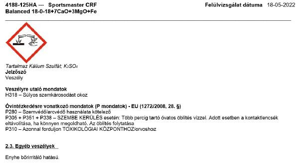 A Sportsmaster CRF 18+0+17+2MgO (Balanced) 2 – 3 hónapos hatástartamú granulált összetett műtrágya az egyenletes fejlődés érdekében. A szemcsék egy része nem burkolt, így a fű számára azonnal felvehető tápanyagforrást nyújt. Hatástartam: 2-3 hónap Dózis: 20-30 g/m2 Kiszerelés: 25 kg-os, színes, műanyag zsák Egy zsák mennyiséggel kezelhető felület: 800-1000 m2 A Sportsmaster CRF 18+0+17+2MgO (Balanced) műtrágya az ICL szabadalmazott Poly-S és PACE burkolási technológiájával készült. Foszforral kiegészített kiegyensúlyozott NK-összetételű műtrágya, amely a tavaszi és a nyári hónapokban használható. Vas- és magnéziumtartalma élénkebbé teszi a gyep színét, elfedi a stressztüneteket. A Sportsmaster CRF 18+0+17+2MgO (Balanced) 2 – 3 hónapos hatástartamú granulált összetett műtrágya az egyenletes fejlődés érdekében. A szemcsék egy része nem burkolt, így a fű számára azonnal felvehető tápanyagforrást nyújt. Száraz gyepfelületre juttassa ki. Kiszórás után öntözze be a területet, ha a kiszórás után 2 napig nem esik csapadék, hogy a műtrágyaszemcsék könnyebben a fű tövéhez jussanak, illetve elsimuljanak a taposás nyomai. A kiszórást gyepszellőztetés (lyuggatás és /vagy hasogatás) után végezze el, hogy megelőzze a műtrágyaszemcsék roncsolódását. Fagyos és aszályos időszakban ne használja a készítményt. Hagyja, hogy a szemcsék tökéletesen elszóródjanak a területen. A termékleírás tájékoztató jellegű, a készítmény felhasználása előtt kérjük, olvassa el a termék használati utasítást! Amennyiben a termékkel kapcsolatosan további kérdése lenne, kérjük, hívjon bennünket. Növényvédelmi szaktanácsadás: +36304139252 Növényvédő szer webáruházunkban számos további termék közül válogathat.