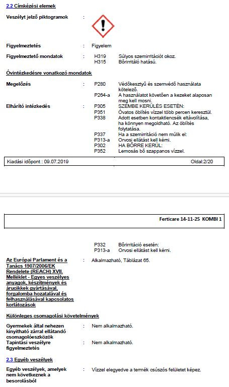 Ferticare 14-11-25 Minden kertészeti növény palántanevelésére, kiültetés utáni indító tápoldatozására, 0,08-0,2% tápoldattal. Mikroelemes kondicionáló lombtrágyázásra a teljes tenyészidőben, 0,3-0,7 % töménységgel. Hatóanyag tartalom: