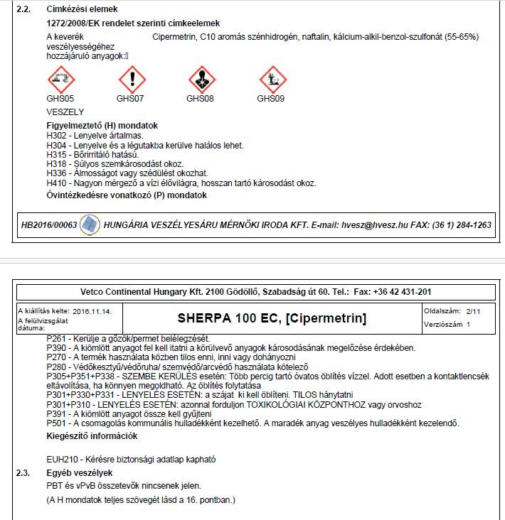 Széles hatású kontakt rovarölő permetezőszer. Házikerti adagolása: 10ml / 10 liter víz Hatóanyag: 100 g/l cipermetrin Forgalmazási kategória: II. (engedélyköteles) A Sherpa a piretroidok között hosszabb hatástartamú, kiváló esőállóságú, megbízható rovarölő szer. Számos izomer elegye amely, valamennyire csökkenti a piretroidokkal szembeni ellenállóság kialakulását. Engedélyezett kultúrák: Kultúra - Károsító - Dózis - Évi (élelmezés egészségügyi várakozási idő) árpa, búza, rozs, tritikálé, zab - gabonapoloska, levéltetvek, vetésfehérítő bogarak - 0,375 l/ha - 21 nap repce - levéltetvek, ormányosbogarak, repcebolha, repcedarázs, repcefénybogár - 0,2-0,25 l/ha - 28 nap burgonya - levéltetvek - 0,25 l/ha - 14 nap cukorrépa - bagolylepkék, levéltetvek, lisztes répabarkó, répabolha - 0,25 l/ha - 14 nap sárgarépa - levéltetvek - 0,25 l/ha - 7 nap saláta - levéltetvek - 0,25 l/ha - 7 nap borsó - bagolylepkék, csipkéző bogarak, levéltetvek, tripsz - 0,25 l/ha - 7 nap bab - bagolylepkék, levéltetvek - 0,25 l/ha - 7 nap komló - levéltetvek - 0,25 l/ha - 14 nap Gyártó: SBM Development Kategória: Rovarölő szer Forgalmazási kategória: II. (enegedély köteles)