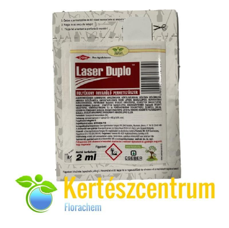 A Laser Duplo egyedi hatásmóddal rendelkezik és más rovarölő szerektől eltérő helyen hat. A sejtmembrán Na+ és Cl- forgalmát befolyásolja, ezzel akadályozza az ingerületátvitelt az idegrendszerben. Javasolt növényvédelmi technológia adott kultúrában: - Szőlőben szőlőmolyok ellen a védekezést szexferomon csapdás rajzásmegfigyelést követően, a lárvakelés kezdetén kell elkezdeni és a permetezést a rajzás intenzitásától függően 7-14 naponként célszerű megismételni. - Káposztafélékben a fehér lepkék (káposztalepke, répalepke) és a bagolylepkék (káposzta-bagolylepke, saláta-bagolylepke) lárvái ellen a védekezés időzítése meghatározó jelentőségű. Az első permetezést az L1-L2 fejlődési stádiumú hernyók ellen kell elvégezni. A kezelést 7-14 naponta 1-2-szer ajánlott megismételni. A káposztafejekbe berágott lárvák ellen használjuk a Reldan 40 EC 1,5 l/ha dózisát, amely kiválóan gázosodó készítmény. - Szabadföldi paprikában tripszek ellen a készítményt kék, fehér vagy sárga színű ragadós lapos megfigyelés alapján, a tripszek táblára történő betelepedésének időszakában, a felszaporodás kezdetén kell kijuttatni. - Burgonyában a permetezést az L1-L2 fokozatú lárvák tömeges megjelenéséhez célszerű időzíteni. A kezelést a kelés intenzitásától függően 7-14 naponta 1-2-szer ajánlott megismételni. - Hajtatott paprikában és dísznövényekben nyugati virágtripsz ellen kék, vagy sárga ragacslapos megfigyelés alapján a védekezést a betelepedés, illetve felszaporodás kezdetén kell megkezdeni, és 2-3 alkalommal, 5-7 napos időközökkel javasolt ismételni. - Hajtatott paprikában és paradicsomban gyapottok-bagolylepke ellen az első permetezést a fiatal (L1-L2 fejlődési stádiumú) hernyók ellen kell időzíteni. A kezelések gyakoriságát a termesztő-berendezés napi átlaghőmérsékletétől függően kell megválasztani. 25°C alatt 7 naponta, 25°C felett 5 naponta javasolt védekezni. - Vöröshagymában, újhagymában és póréhagymában a tripsz imágók és lárvák rendszeres növényenkénti ellenőrzésével illetve sárga vagy kékszínű vizes tálcsapdákkal végzett egyedszám-felméréssel lehet a kijuttatást megfelelően időzíteni. A tripszek betelepedése áprilisban megkezdődik. Az első permetezést a betelepedés kezdetén szükséges elvégezni. A készítmény kijuttatásához nedvesítő szert és 400- 500 l/ha vízmennyiséget célszerű felhasználni. - Alma, körte, birsalma, naspolya molykártevői ellen feromoncsapdás rajzásmegfigyeléshez igazítva kell permetezni a tömeges lárvakeléskor. A védekezést a rajzás intenzitásától függően 7-14 naponként kell megismételni. - Körtében előrejelzésre alapozva, a körtelevélbol hák fiatal lárváinak megjelenésekor kell a kezelést elvégezni. Gyakorlati felhasználási javaslatok: Szabadföldi kultúrák esetén a rezisztencia kialakulásának elkerülése érdekében a készítményt évente legfeljebb 3 alkalommal, javasolt felhasználni. Hajtatott kultúrák esetében a rezisztencia kialakulásának elkerülése érdekében a 3. kijuttatás után célszerű más hatóanyagcsoportba tartozó szert alkalmazni. A készítmény egy kultúra termesztési ciklusa alatt legfeljebb 3 alkalommal használható. Mivel a készítmény toxikus hatása révén gátolja a fürkészdarazsak lárvakelését, az üvegházi molytetű elleni biológiai védekezés esetén az Encarsia formosa parazitoid min. 1 héttel a kezelés után telepíthető. A poszméhek kaptárait a kezelés előtt 1,5-2 órával le kell zárni és a permetlécseppek felszáradásáig zárva kell tartani. A permetlé mennyiségét a kezelendő növényállomány fejlettségétől, lombfelületétől és művelésmódjától, valamint az alkalmazott növényvédelmi gép típusától függően kell megválasztani és törekedni kell a tökéletes permetléfedettségre. Káposztában és paprikában a kijuttatáshoz tapadásfokozó szer használata indokolt. Dísznövényekben a kezelést megelőzően fitotoxicitási próba végzése szükséges. A készítmény kijuttatásához melegködképző nem használható. A készítmény biogazdálkodásban engedélyezett rovarölő szer. Forgalmazási kategória: II. Munkaegészségügyi várakozási idő: 0 nap